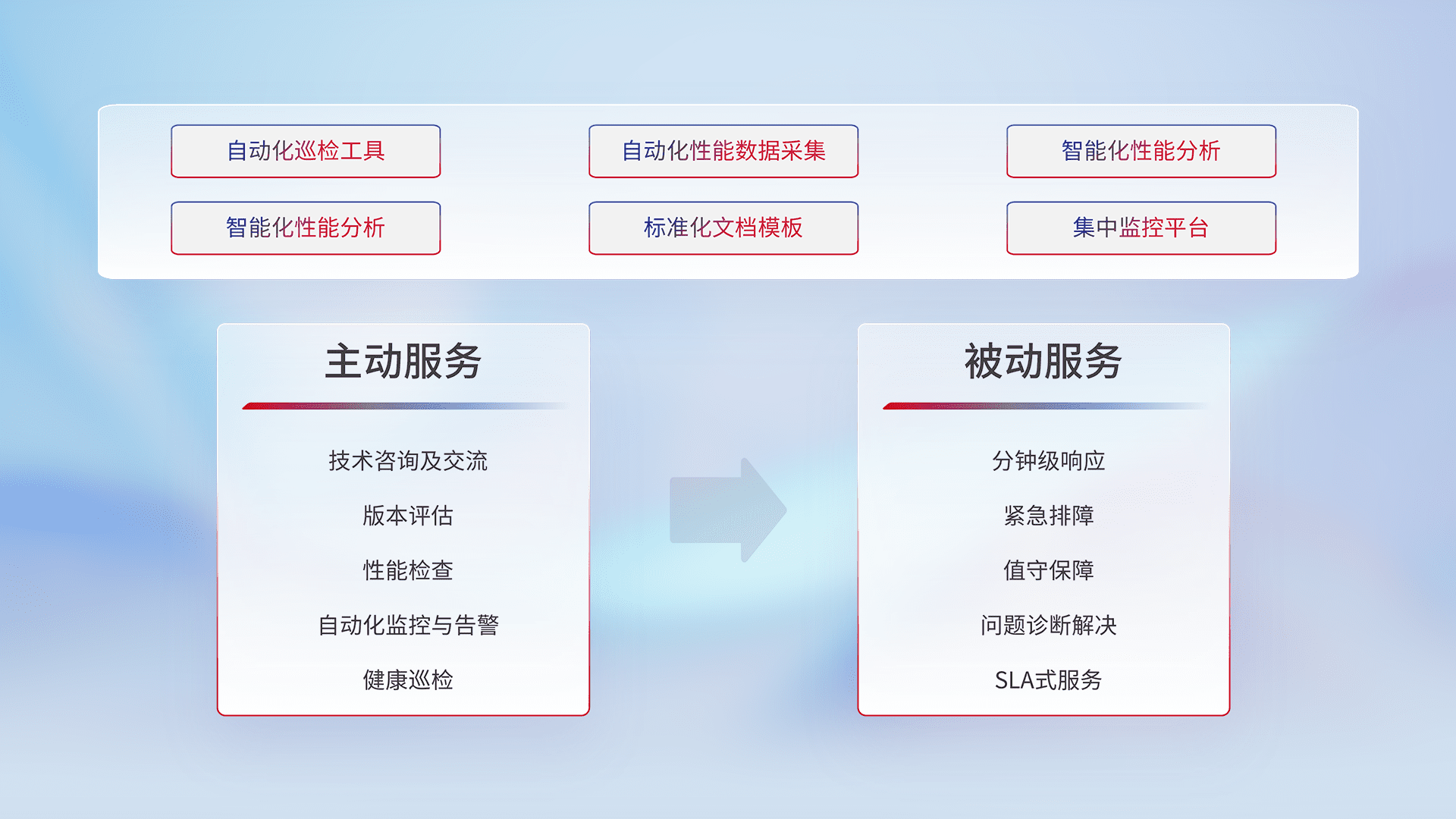 智能化工具和标准化文档,,保障服务质量,,,提供主动服务(包含技术咨询、、、、版本评估、、、、性能检查、、、、自动化监控与告警、、、、健康巡检)和被动服务包含(分钟级响应、、紧急排障、、、、值守保障、、问题诊断解决、、、、SLA服务)。。。。